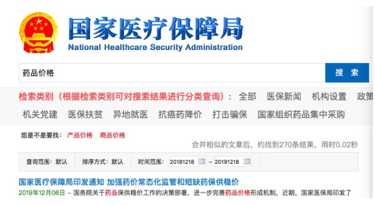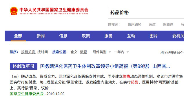 在国家卫生健康委官网搜索,光2019年就有约500个是跟药品价格相关的文件和信息。