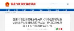 11月19日,国家市场监督管理总局发布《市场监管领域重大违法行为举报奖励暂行办法(修订征求意见稿)》(以下简称《办法》)公开征求意见通知。鼓励社会公众积极举报市场监管领域重...[详细]