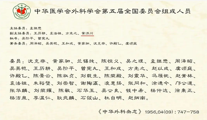 20世纪50年代,黄济川受到周总理亲切接见和鼓励,新中国中医外科四大名医黄济川、石筱山、杜自明、赵炳南,1956年7月跻身于中华医学会外科学会常务委员。其中黄济川任学会四位副主任委员之一,获得了中医外科在我国医学史上最高学术地位。