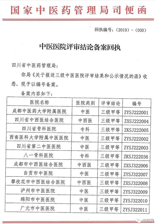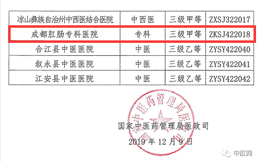 根据《国家中医药管理局办公室关于做好中医医院评审有关工作的通知》(国中医药办医政发〔2017〕3号)等相关文件精神, 经四川省中医医院评审委员会审议,于2019年8月22日对成都肛肠专科医院等78家三级中医医院评审拟合格名单予以公示。