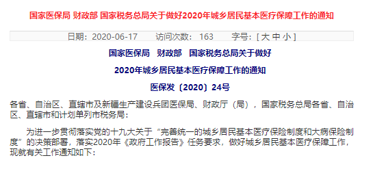 附:国家医保局 财政部 国家税务总局 关于做好2020年城乡居民基本医疗保障工作的通知